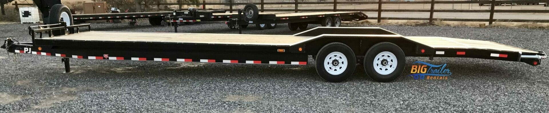 All of the car trailers in our fleet feature a dovetail. The dovetail is generally about 4′ long and offers a decline at the rear of the trailer. The rear most part of the dovetail, which is the lowest point of the bed, is generally about 5″ lower than the rest of the bed height. To lower the bed even further, the trailer can be disconnected from the towing vehicle so that the front jack can be raised. The rear support jacks can then be utilized to support the weight of the vehicle being loaded. This is especially important for low profile vehicles that have very little clearance.